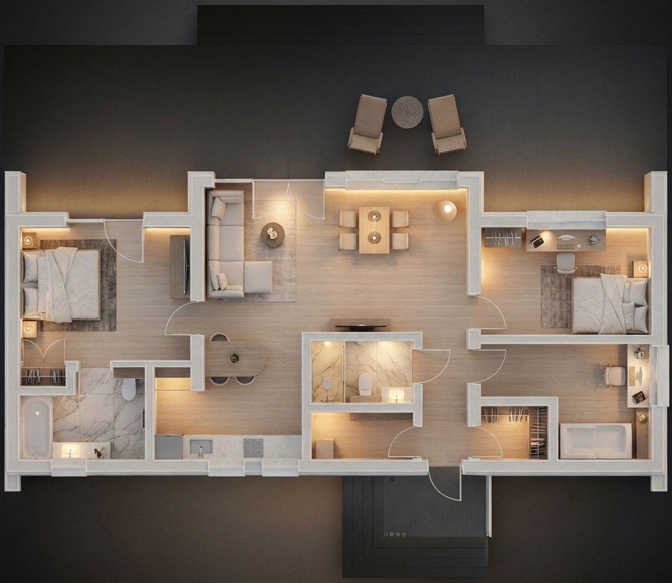 Panorāmas logi, plaša atvērta terase un pārdomāta arhitektūra maigi saplūdina iekštelpas ar ārtelpām, saglabājot gan patīkamu privātumu, gan īstu mājas siltuma un komforta sajūtu.